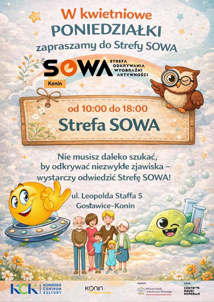 Jednym z najciekawszych wydarzeń miesiąca będzie Familijna sobota w SOWA Konin, która odbędzie się 18 kwietnia o godz. 14:00.