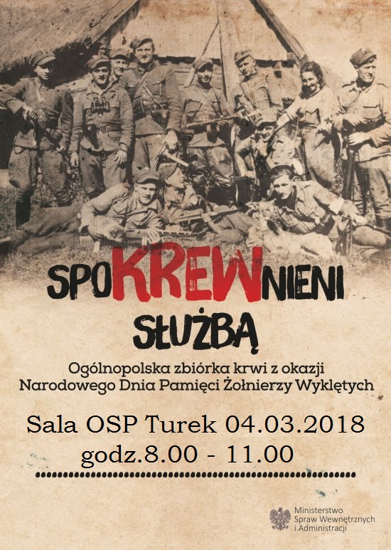 Pod patronatem Ministerstwa Spraw Wewnętrznych i Administracji na terenie województwa wielkopolskiego zostaną przeprowadzone zbiórki krwi w ramach akcji „spoKREWnieni służbą”. Celem akcji jest oddanie hołdu Żołnierzom Wyklętym.