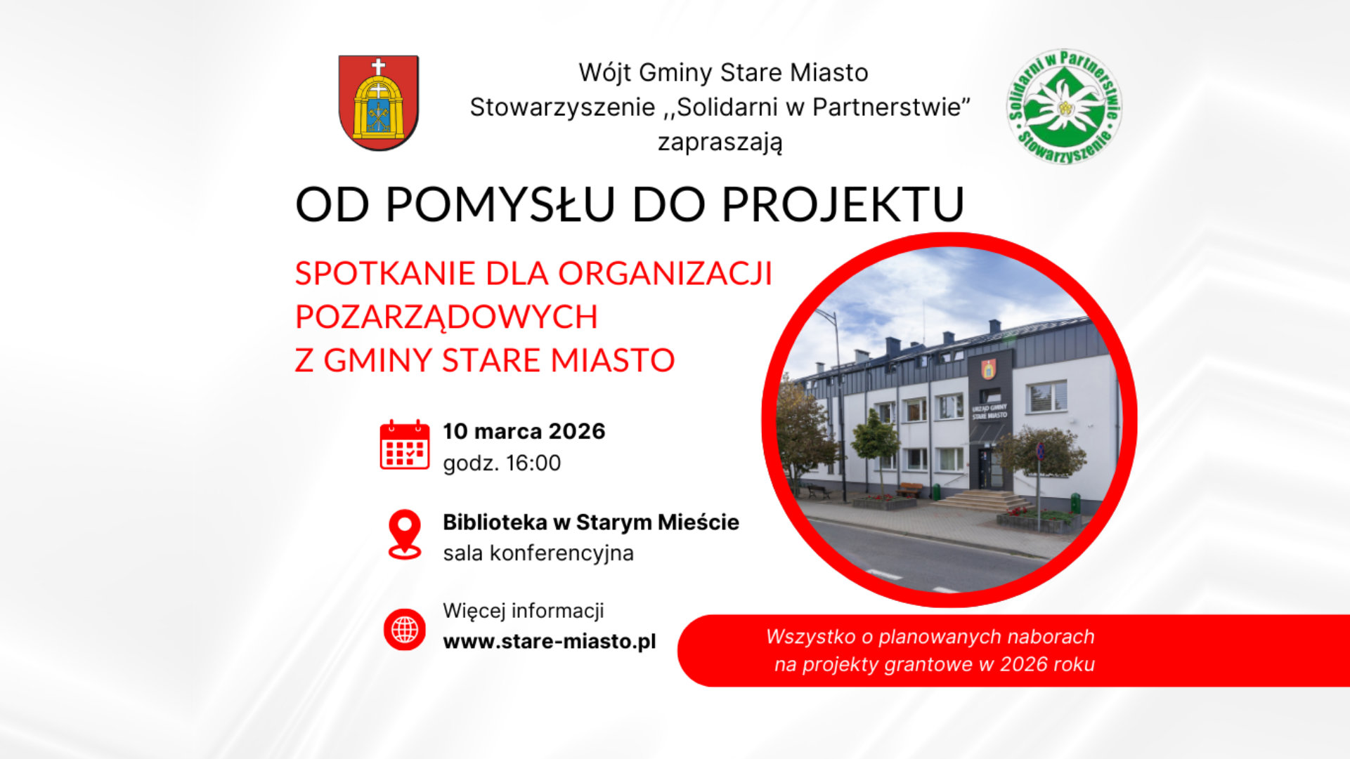 Stare Miasto zaprasza przedstawicieli organizacji pozarządowych na spotkanie poświęcone programom grantowym 2026. Wójt Gminy Stare Miasto oraz Stowarzyszenie „Solidarni w Partnerstwie” organizują wydarzenie, podczas którego omówione zostaną planowane nabory na projekty grantowe w 2026 roku.