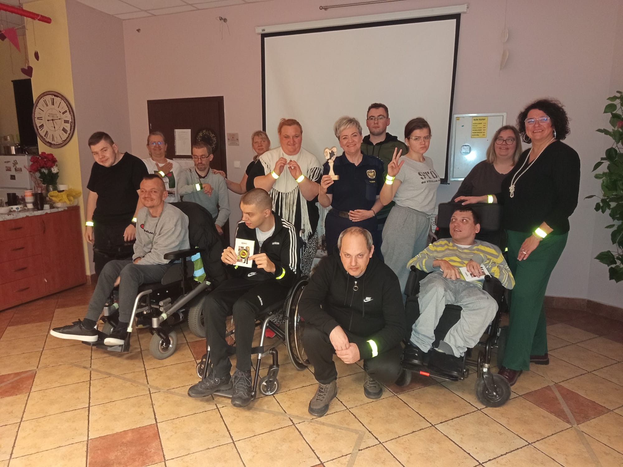 Podopieczni Fundacji chętnie uczestniczyli w spotkaniu, słuchając o codziennych zadaniach strażników oraz o najważniejszych zasadach bezpiecznego poruszania się po drogach. Uczestnicy aktywnie odpowiadali na pytania, sami także zadawali liczne pytania, dzięki czemu zajęcia miały formę otwartego i angażującego dialogu. Atmosfera wyróżniała się życzliwością, uważnością i pozytywną energią.