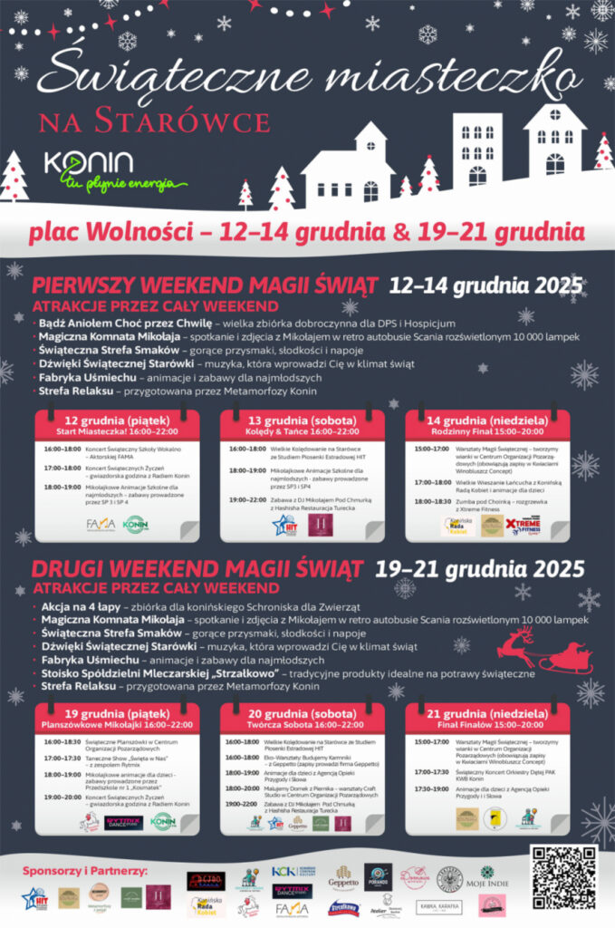 Konińska Starówka już w ten weekend ponownie zamieni się w tętniące życiem, kolorami i dźwiękami Miasteczko Świąteczne! Przez dwa kolejne weekendy mieszkańcy i goście Konina będą mogli zanurzyć się w atmosferze świąt. Będą mogli korzystać z atrakcji dla całych rodzin, koncertów, warsztatów oraz niezwykłych spotkań z Mikołajem w wyjątkowej, rozświetlonej „Magicznej Komnacie”. To wydarzenie, które od lat buduje lokalną tradycję i jednocześnie zaskakuje nowymi pomysłami.