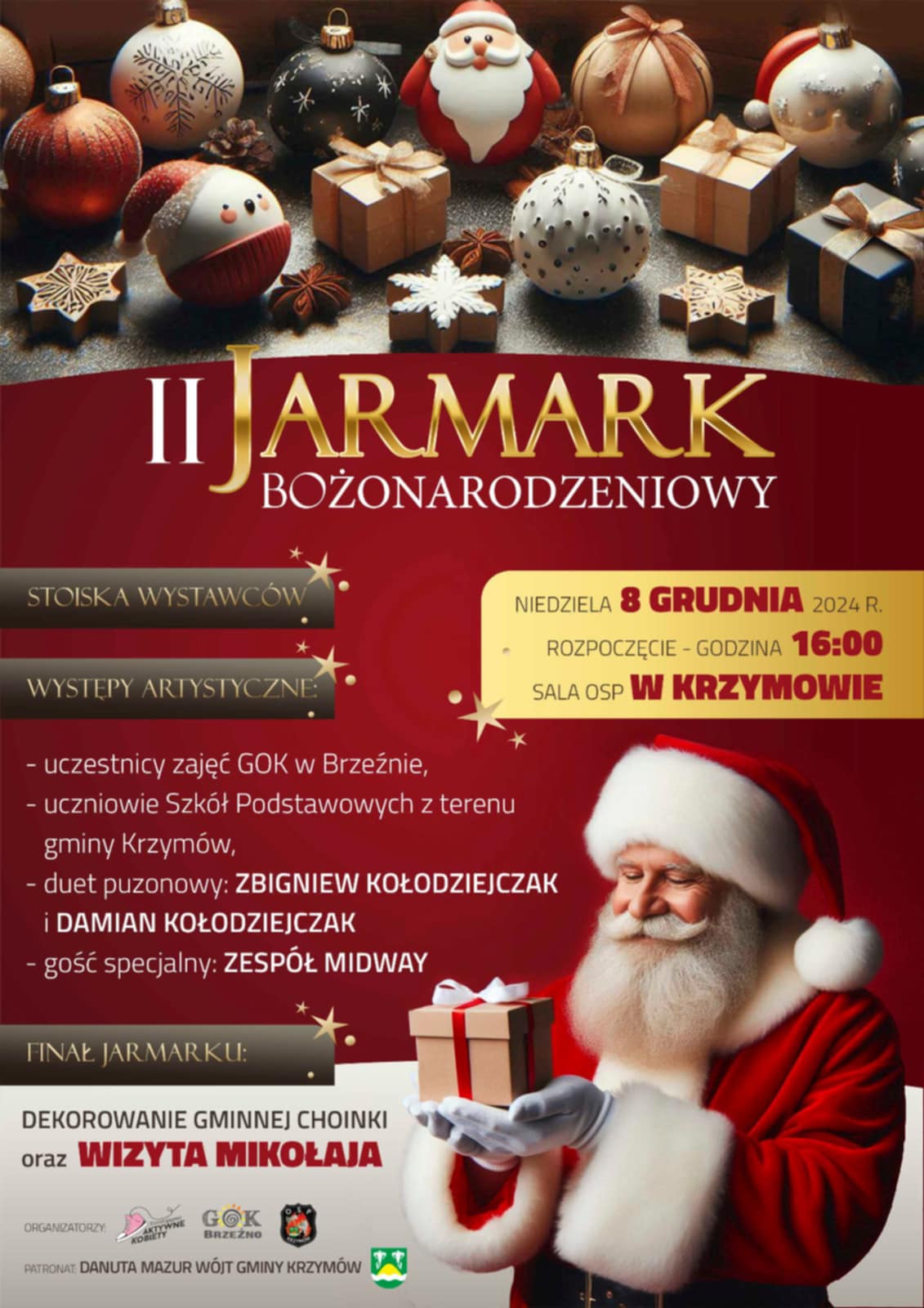 Po sukcesie zeszłorocznej edycji, Jarmark Bożonarodzeniowy w Krzymowie powraca! Wydarzenie odbędzie się 8 grudnia w sali Ochotniczej Straży Pożarnej w Krzymowie. Start zaplanowano na godzinę 16:00.
