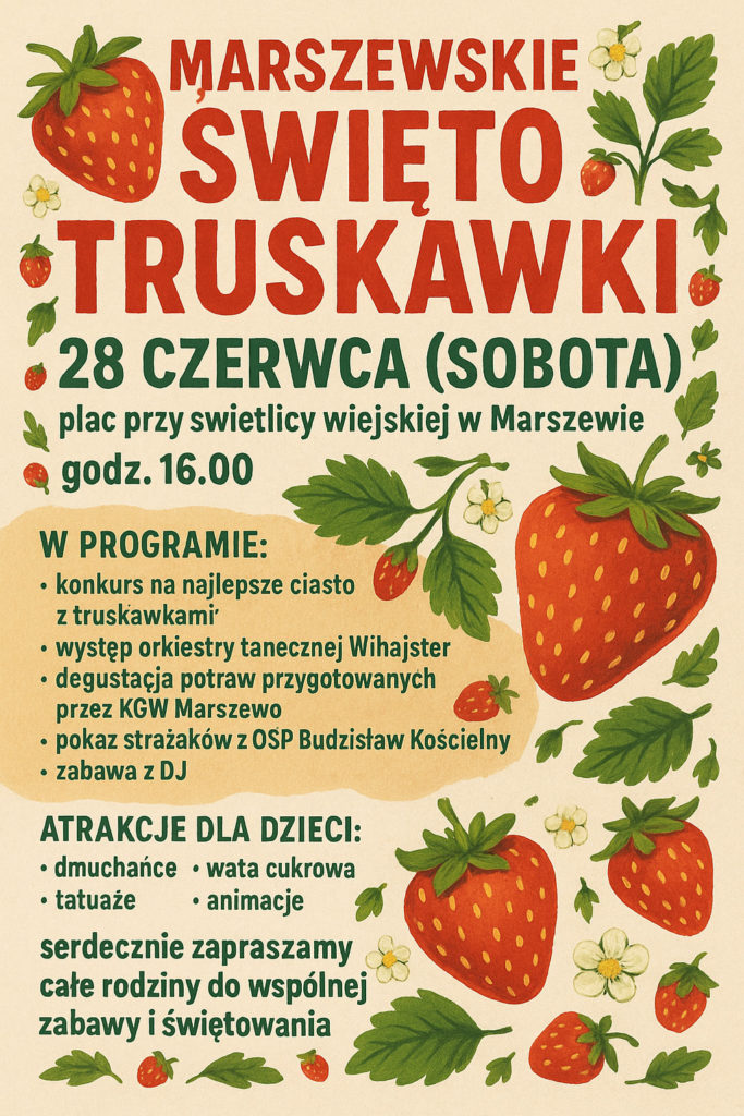 Truskawka będzie główną bohaterką sobotniej imprezy w Marszewie. KulturaZaproszenie 26/06/2025 Mniej niż 1 min. PROMOCJA Wydarzenia„Dzieciństwo bez przemocy” Konin włącza się w ogólnopolską kampanię.Redakcja LP - 4 godziny ago0KulturaStypendia Prezydenta Miasta Konina w dziedzinie kulturyRedakcja LP - 1 dzień ago0WydarzeniaZACHWYTNIKI 2025 – Wielkopolska pełna inspiracji!Redakcja - 20/10/20250ZdrowieNowoczesna Klinika Neurologii ICZMP – „Pomagamy Jak Umiemy” RossmannRedakcja LP - 14/10/20250AktualnościROSSMANN „MOJA DROGERIA” – NOWY WYMIAR ZAKUPÓW I BLISKOŚCIRedakcja - 10/10/20250 FacebookTwitterWhatsApp MASZ WAŻNĄ WIADOMOŚĆ? Prześlij do naszej redakcji zdjęcie, film, lub informację! +48 63 242 01 01 Zapraszamy serdecznie na Marszewskie Święto Truskawki wspólnie z Kołem Gospodyń Wiejskich w Marszewie. - Reklama - PROMOCJA Wydarzenia„Dzieciństwo bez przemocy” Konin włącza się w ogólnopolską kampanię.Redakcja LP - 4 godziny ago0KulturaStypendia Prezydenta Miasta Konina w dziedzinie kulturyRedakcja LP - 1 dzień ago0WydarzeniaZACHWYTNIKI 2025 – Wielkopolska pełna inspiracji!Redakcja - 20/10/20250ZdrowieNowoczesna Klinika Neurologii ICZMP – „Pomagamy Jak Umiemy” RossmannRedakcja LP - 14/10/20250AktualnościROSSMANN „MOJA DROGERIA” – NOWY WYMIAR ZAKUPÓW I BLISKOŚCIRedakcja - 10/10/20250 TagiKGWMarszewoŚwiętowanieTruskawkazabawa Redakcjahttps://konin24.info Szukaj Konin zachmurzenie duże enter location 9.5 ° C 9.5 ° 9.5 ° 81 % 3kmh 100 % śr. 9 ° czw. 12 ° pt. 11 ° sob. 13 ° niedz. 13 ° Sygnał24INFO Zmiana organizacji ruchu przy cmentarzu w Sompolnie – 1 listopada 29/10/2025 Policjanci z Konina zabezpieczyli nielegalny tytoń i papierosy bez polskich znaków akcyzy 29/10/2025 Wyłączenie sygnalizacji świetlnej na skrzyżowaniu Przemysłowa – Paderewskiego w Koninie 29/10/2025 Uwaga! Fałszywi ankieterzy w gminie Kramsk – ważny komunikat dla mieszkańców 28/10/2025 Tymczasowa zmiana organizacji ruchu w Wilczogórze 28/10/2025 Poprzedni artykułWiktor Ludwiczak z III kategorią szachową i 18. miejscem na Mistrzostwach Wielkopolski do lat 9Następny artykułWójt Grzegorz Matuszak z absolutorium za wykonanie budżetu 2024 Mogłeś przegapić Bezpłatna lekcja tańca towarzyskiego w Koninie – Zbigniew Witkowiak Zaproszenie 29/10/2025 (Przed)Halloweenowe Spotkanie z Grami Planszowymi w konińskiej bibliotece Zaproszenie 29/10/2025 Tancerze z BAS pokazali klasę w Mistrzostwach Polski Breaking WARSAW MOVES! Aktualności 29/10/2025