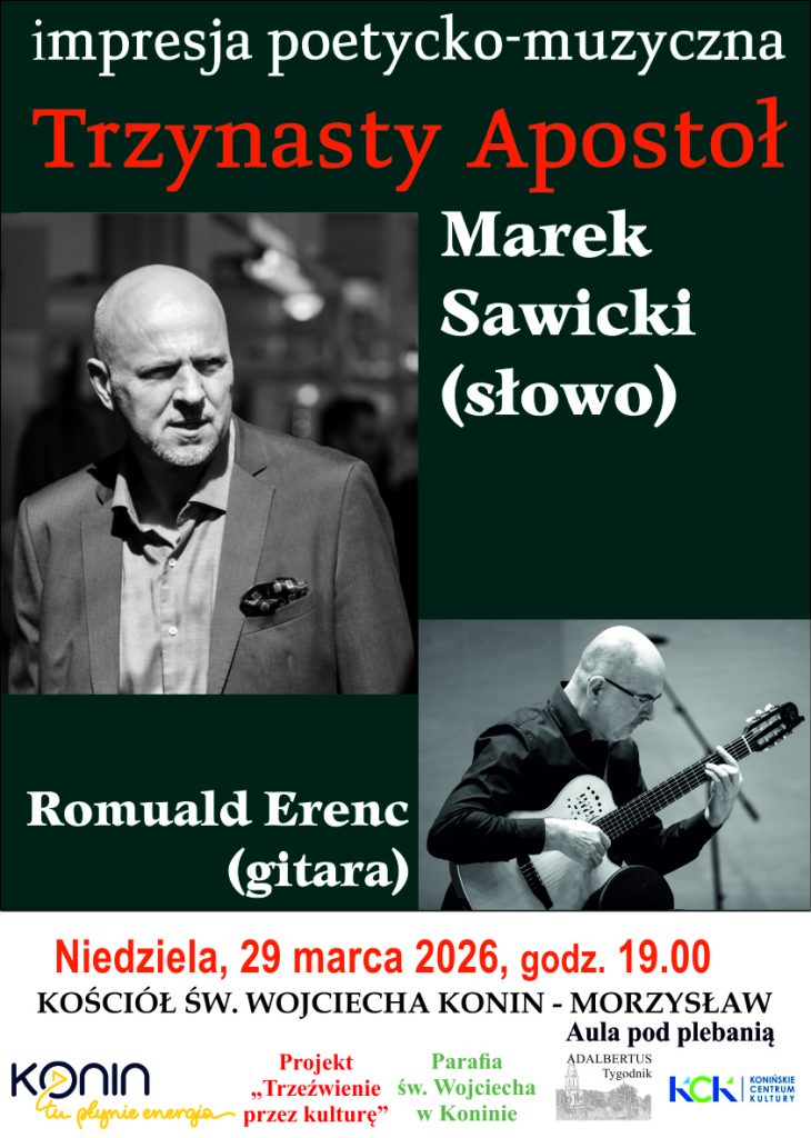 W niedzielę, 29 marca o godz. 19:00 mieszkańcy miasta i regionu będą mogli uczestniczyć w wyjątkowym wydarzeniu kulturalnym. Trzynasty Apostoł Konin to spektakl poetycko-muzyczny, który odbędzie się w auli przy parafii św. Wojciecha w Morzysławiu. Co ważne, wstęp na wydarzenie jest całkowicie bezpłatny, dlatego każdy zainteresowany może wziąć w nim udział bez wcześniejszych zapisów.