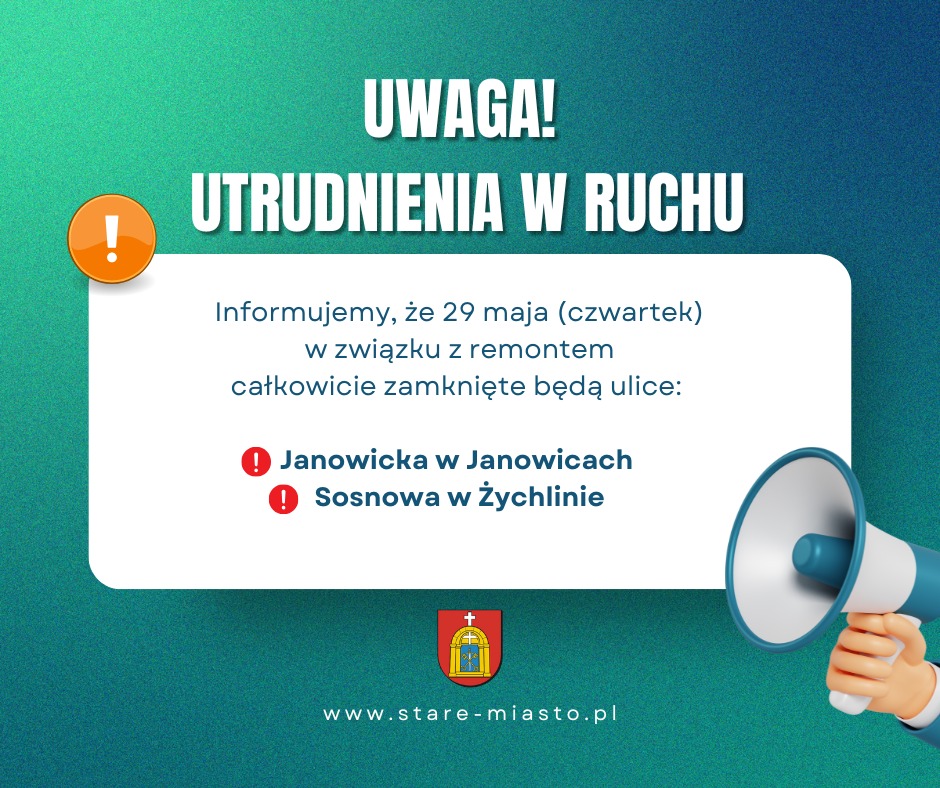 W czwartek, 29 maja, mieszkańcy i kierowcy poruszający się po gminie Stare Miasto muszą liczyć się z istotnymi utrudnieniami w ruchu drogowym. Tego dnia całkowicie wyłączone z ruchu zostaną: