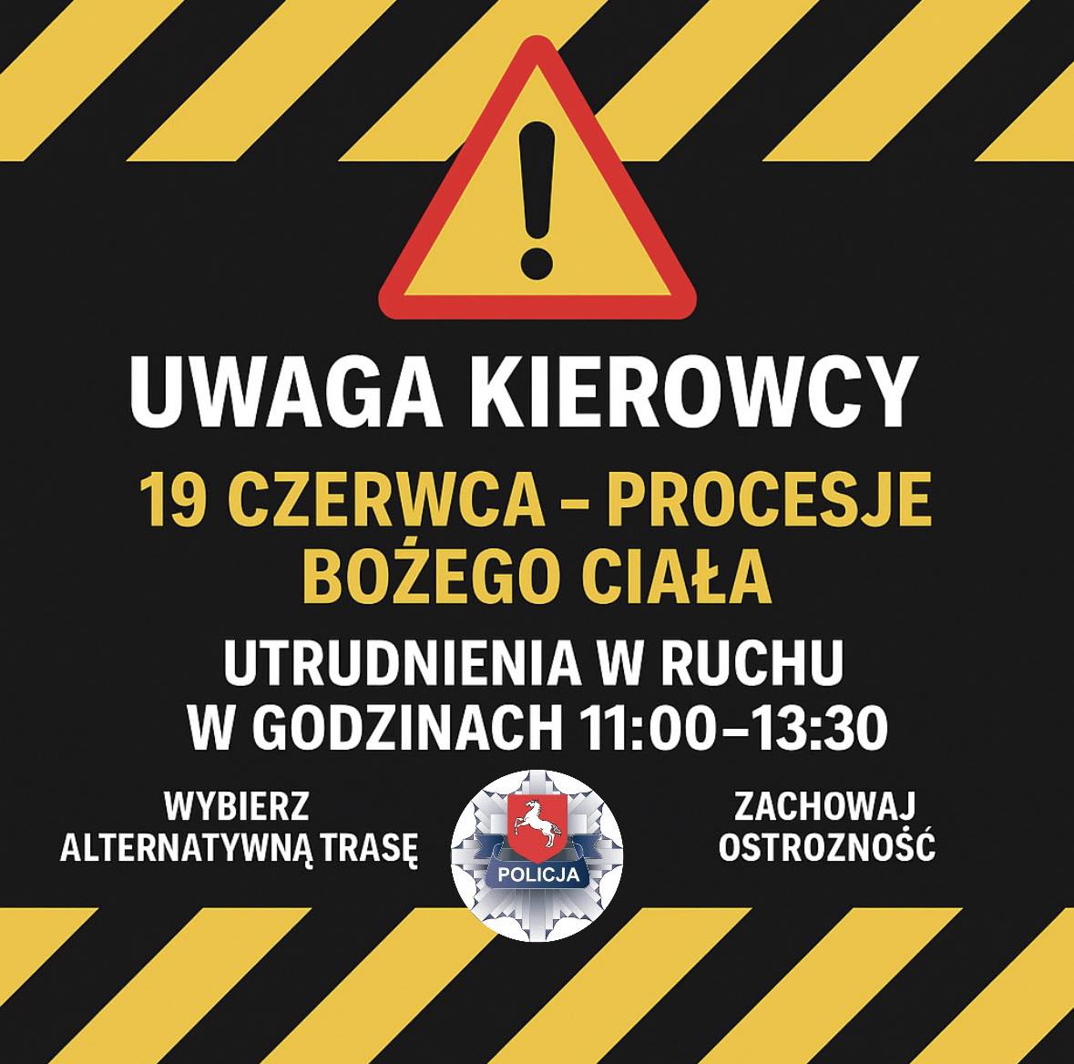 W czwartek 19 czerwca na terenie Konina oraz sąsiednich gmin odbędą się procesje z okazji uroczystości Bożego Ciała. Wydarzenia te spowodują czasowe utrudnienia w ruchu drogowym. Policja apeluje do kierowców o ostrożność, cierpliwość oraz – w miarę możliwości – wybieranie tras alternatywnych.