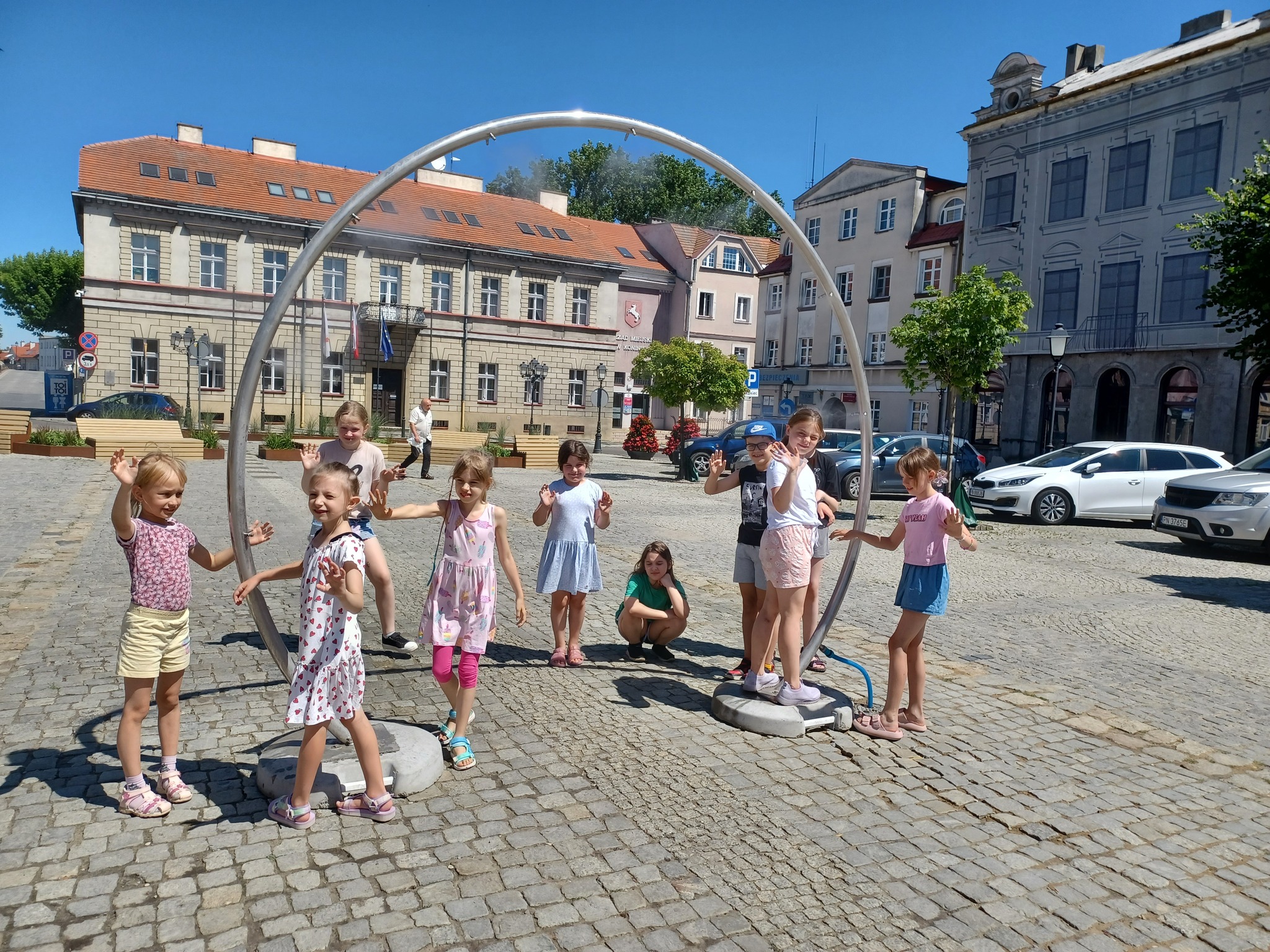 Po spacerze przyszedł czas na zabawy integracyjne z wykorzystaniem kolorowej chusty animacyjnej i bum bum rurek – było głośno, muzycznie i bardzo radośnie. Kolejnym punktem programu była zabawa na placu zabaw, a w drodze powrotnej uczestnicy skorzystali z mgiełki wodnej na Placu Wolności, która przyniosła upragnione ochłodzenie w upalny dzień.