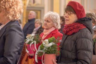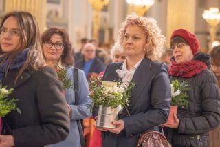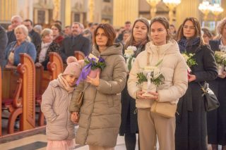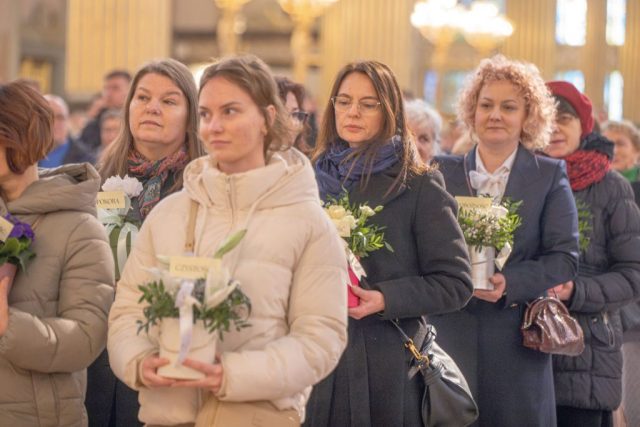 Jednym z najbardziej poruszających momentów liturgii była procesja z darami. Kobiety, reprezentujące różne pokolenia i różne życiowe powołania, przyniosły do ołtarza bukiety kwiatów symbolizujące dziesięć cnót Najświętszej Maryi Panny.