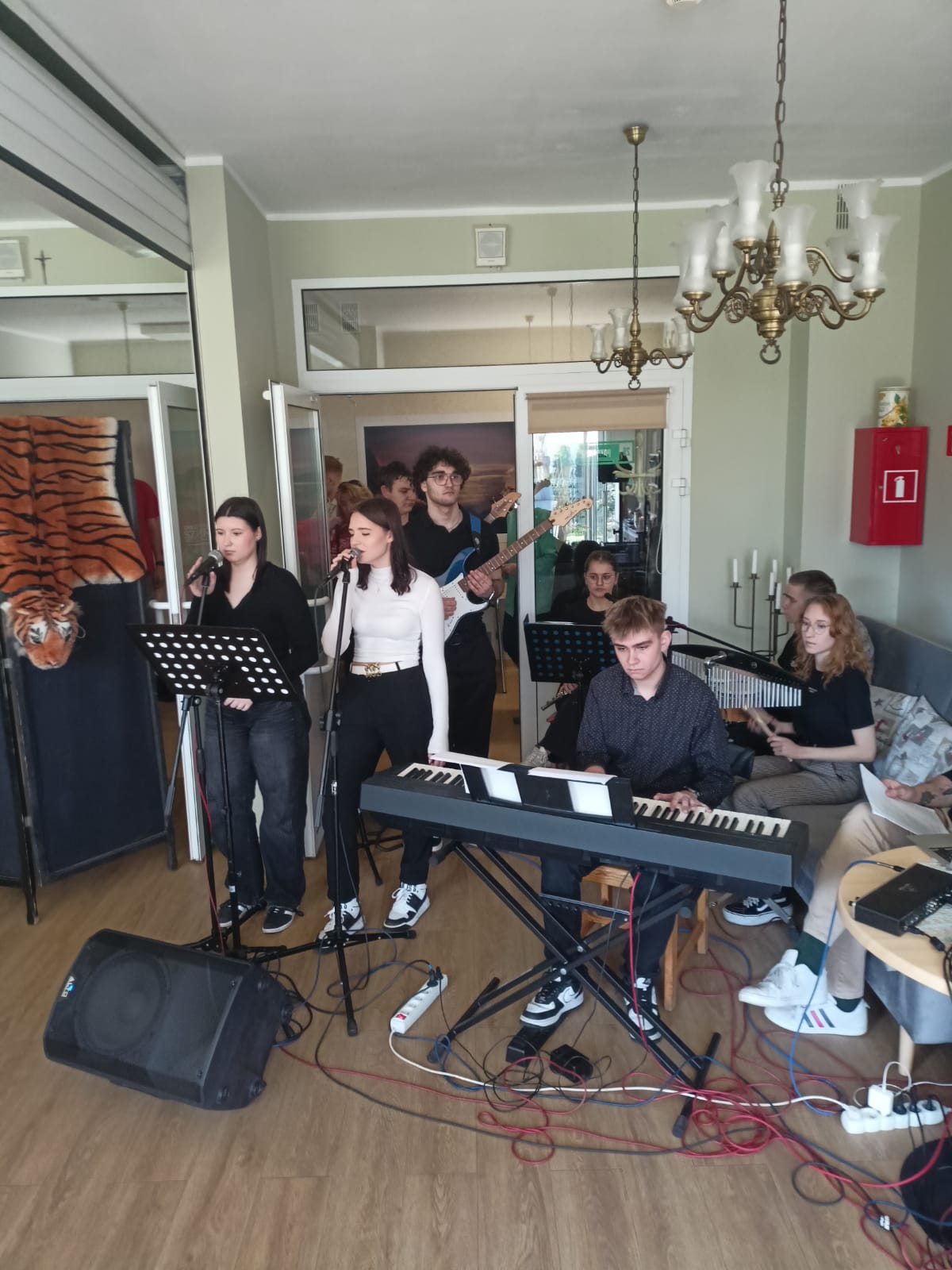Po występie uczniowie i opiekunowie zostali serdecznie ugoszczeni przez gospodarzy. Na stołach pojawiła się aromatyczna kawa oraz domowe racuchy, przygotowane specjalnie na tę okazję przez panią Mariannę. Życzliwość i ciepła atmosfera sprawiły, że spotkanie miało rodzinny charakter.