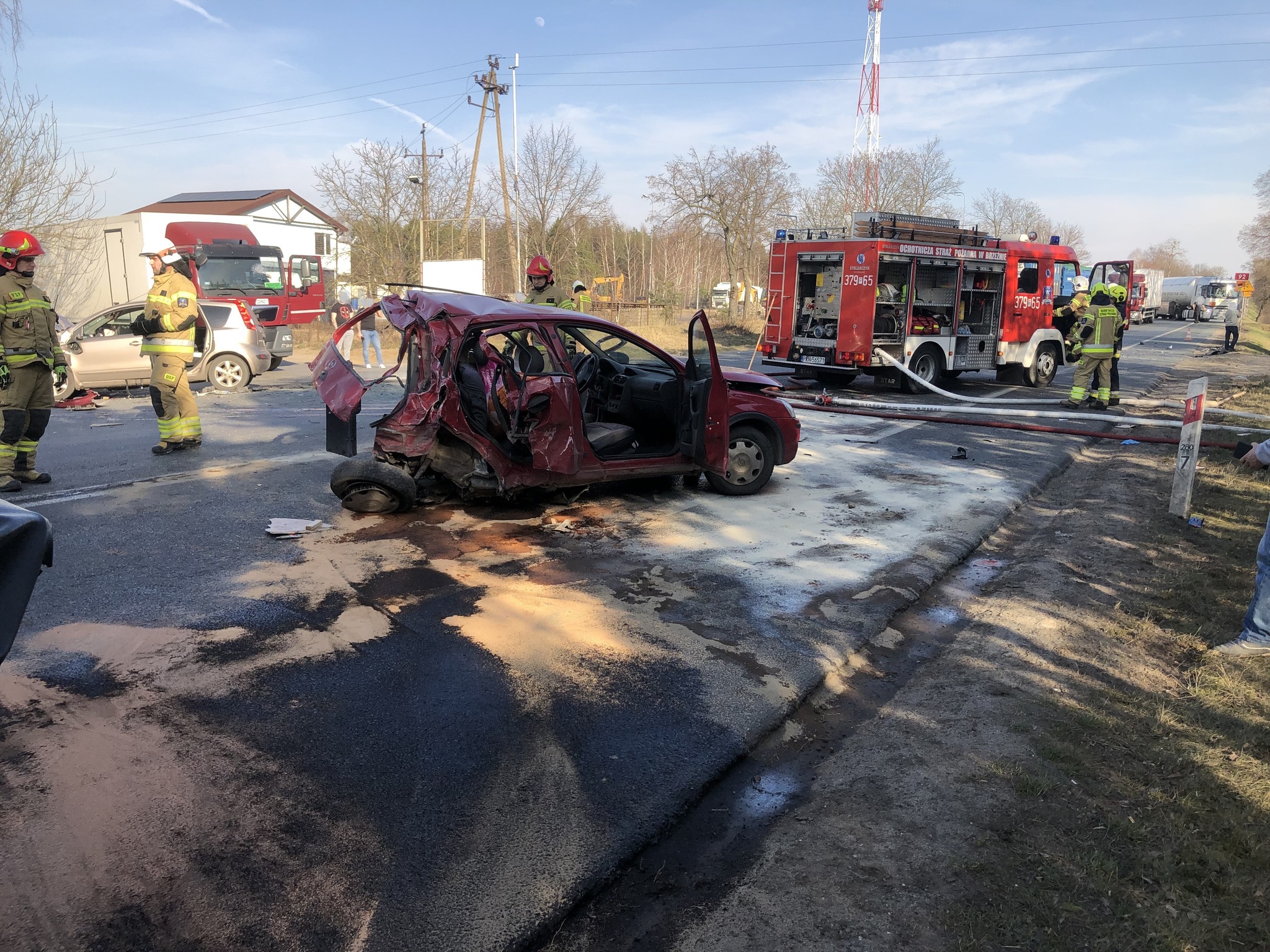 Droga krajowa nr 92 została całkowicie zablokowana w obu kierunkach. Strażacy zabezpieczyli miejsce zdarzenia, udzielili poszkodowanej kobiecie kwalifikowanej pierwszej pomocy, używając urządzeń hydraulicznych do wykonania dostępu i ewakuacji z pojazdu. Następnie kobieta została przekazana Zespołowi Ratownictwa Medycznego. Kolejny Zespół Ratownictwa Medycznego udzielił pomocy pozostałym poszkodowanym, którzy zostali przetransportowani do szpitala.
