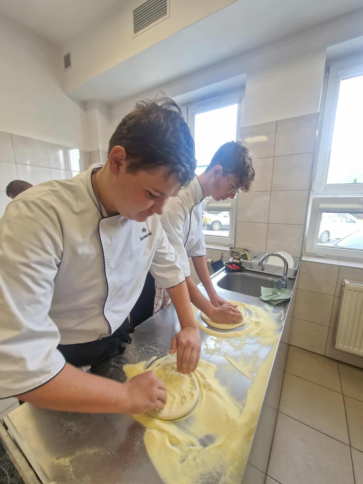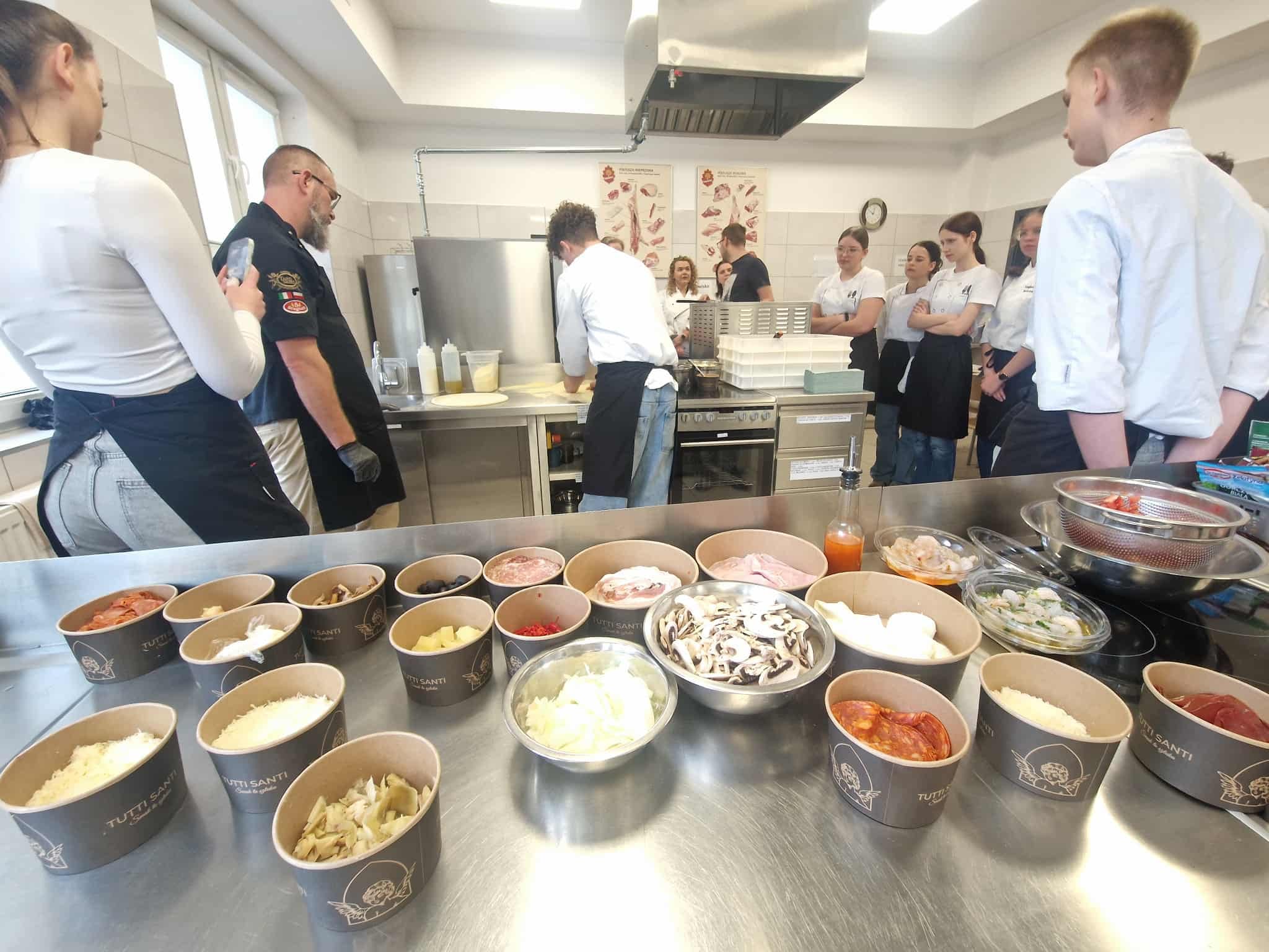 Podczas zajęć młodzież z klasy 3 Technikum Żywienia miała okazję poznać autentyczne włoskie składniki i samodzielnie przygotować pizzę, odkrywając, że jej sekret tkwi w odpowiednio przygotowanym cieście. Warsztaty połączono z wykładami o historii włoskiej kuchni oraz kulturze kulinarnej Italii, które spotkały się z dużym zainteresowaniem uczniów.