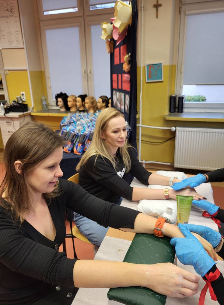 W zajęciach udział wzięły uczennice klas 4 i 5 technikum usług fryzjerskich, które przygotowały dla zaproszonych pań kompleksowe zabiegi. Uczestniczki mogły skorzystać z profesjonalnych stylizacji włosów oraz relaksacyjnych zabiegów pielęgnacji dłoni, obejmujących peeling i nawilżający balsam. Była to nie tylko okazja do poprawy wyglądu, ale również chwila wytchnienia i rozmowy w przyjaznej atmosferze.