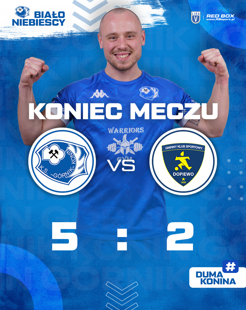 W rozegranym dziś meczu 26. kolejki Górnik Konin pokonał GKS Dopiewo 5:2 i umocnił swoją pozycję w czołówce tabeli. Po pierwszej połowie biało-niebiescy prowadzili 2:1, a po przerwie dołożyli trzy trafienia, pieczętując zasłużony triumf.